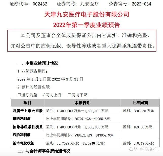 4月12日,九安医疗发布《2022年第一季度业绩预告》和《2021年度业绩快报》,在一季度报预告中,提到预计一季度净利润为140亿元-160亿元,同比增长36707.43%—41965.63%。受此消息刺激,九安医疗12日、13日连续两天冲上涨停板。