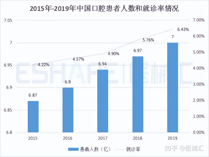 截至2019年,我国口腔患者人数已达到7亿人,约占国民总人数的50%,而就诊率仅为6.43%。我国患有口腔疾病的群体逐年上升,但就诊率却得不到较大提升,口腔疾病的治疗仍然被很多人忽视。